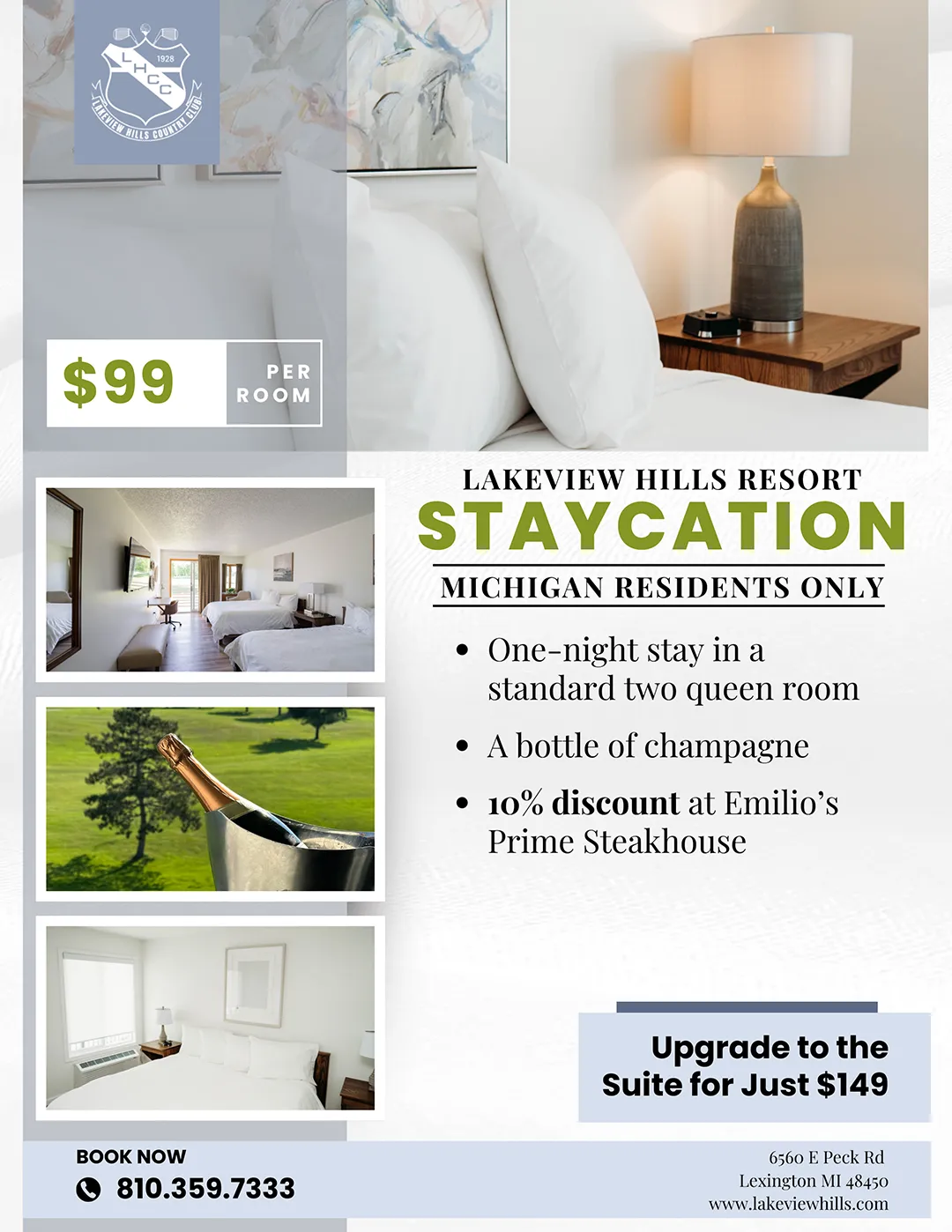 Lakeview Hills Resort in Lexington, Michigan is a stunning destination with so much to offer. From the moment we arrived, we were impressed by the beautifully maintained gofl course and the overall atmosphere of the resort. The rooms are freshly renovated, combingin an upscale, modern feel with cozy fomfort. We enjoyed dinner at Emilio's Prime Steakhouse, where we were seated in a stylish half-circle booth. The service was warm and atentive, and the food was outstanding. As we explored the property, we came across their brand new pickleball courts and a breathaking hand-painted Italian dining room, perfect for hosting a rehearsal dinner or special event. Just minutes from the beach and downtown, this resort turly has it all including a relaxing spa experience. If you're visitng Lexington, this is wothout a doubt the best place to stay.